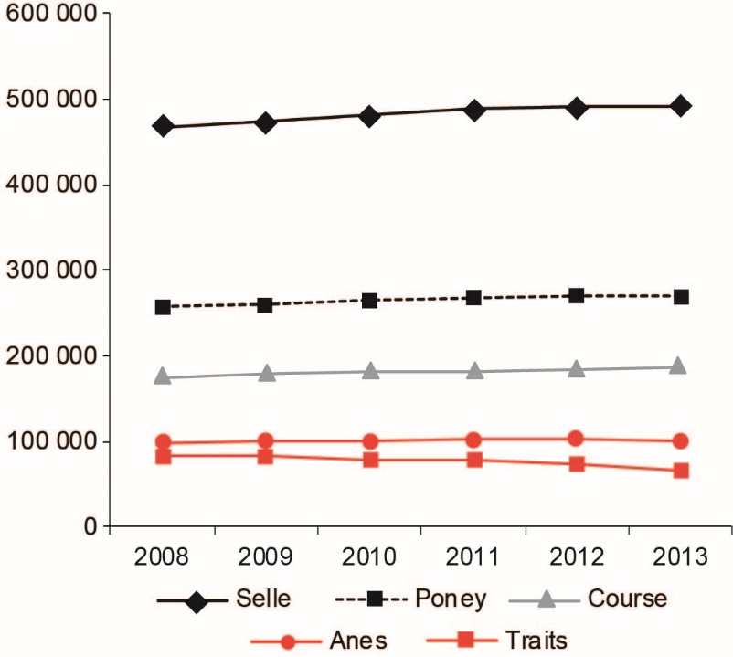 Figure 1. Évolution des différents types de cheptels équins en France sur la période 2008-2014 (source : Ifce-OESC).