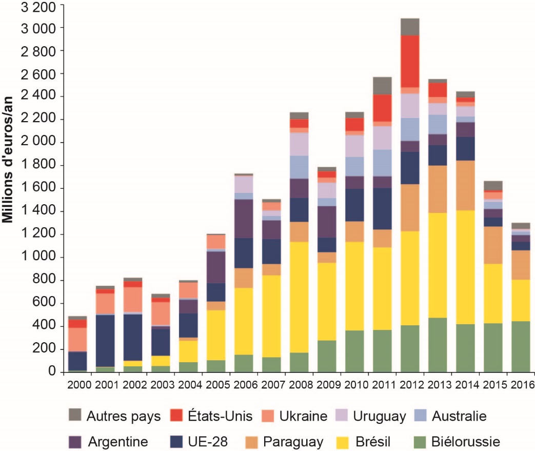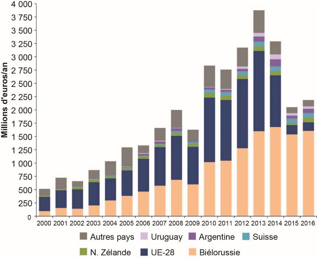 Figure 4. Importations de la Russie dans le secteur bovin* entre 2000 et 2016 (Millions d’euros courants par an), (Source : BACI/Traitement INRA, SMART-LERECO).