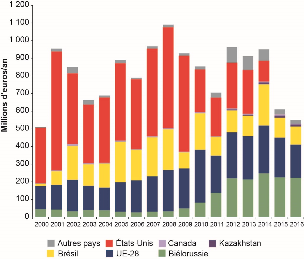 Figure 5. Importations de la Russie dans le secteur avicole* entre 2000 et 2016 (Millions d’euros courants par an), (Source : BACI/Traitement INRA, SMART-LERECO).
