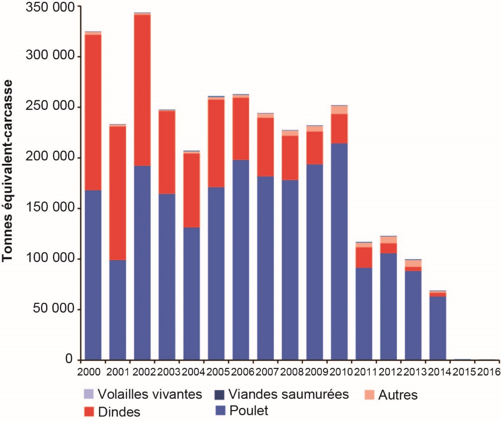 Figure 6. Exportations de l’UE-28 vers la Russie dans le secteur avicole entre 2000 et 2016 (tonnes équivalent-carcasse), (Source : Comext/Traitement INRA, SMART-LERECO).