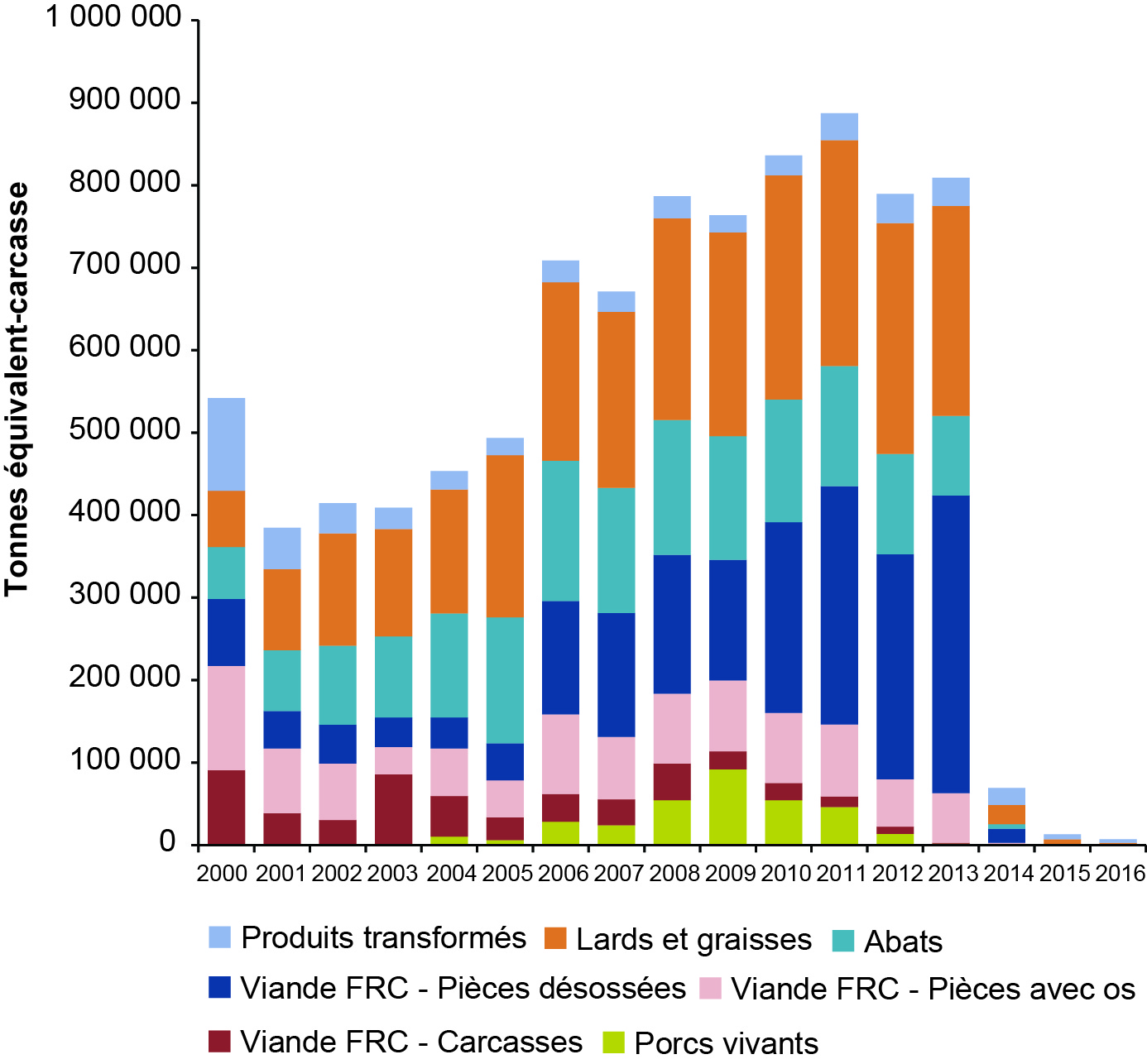Figure 8. Exportations de l’UE-28 vers la Russie dans le secteur porcin entre 2000 et 2016 (tonnes équivalent-carcasse), (Source : Comext/Traitement INRA, SMART-LERECO).