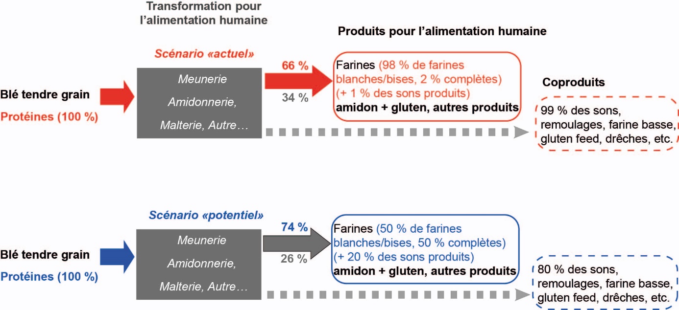 Sur la totalité du lait produit par les ruminants laitiers, il faut en soustraire la quantité donnée aux jeunes et celle qui est écartée pour cause de traitements médicamenteux. Environ 0,04 % du lait de vache livré pour la consommation humaine est ensuite écarté car il contient des résidus inhibiteurs, puis de 1 à 3 % est perdu dans les effluents à la première transformation (Bareille et al., 2015). Nous avons considéré que 2 % du lait effectivement produit était écarté de la chaine de consommation et que tout le reste était totalement consommable.