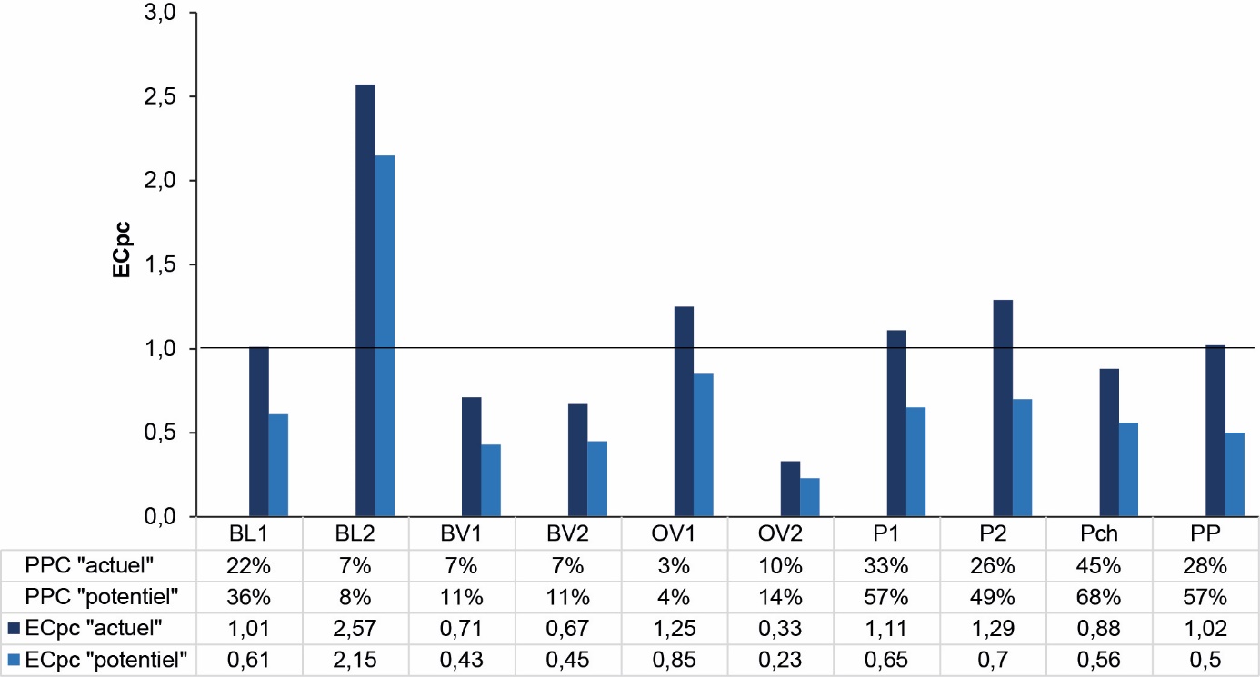 Ppc : Proportions en protéines « consommables par l’Homme » des rations des systèmes d’élevages présentées dans les tableaux 4 et 5, selon le scénario « potentiel » ; ECpc : Efficience de Conversion des protéines « consommables par l’Homme ».