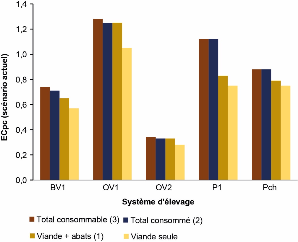 ii) La seconde consiste à ne considérer que la part des protéines (ou de l’énergie brute) consommée et produite par l’élevage qui est valorisable en alimentation humaine : il s’agit alors de l’efficience de conversion des protéines (ou de l’énergie) « consommables par l’Homme » (ECpc ou ECec), aussi appelée l’efficience protéines ou énergétique « nette »