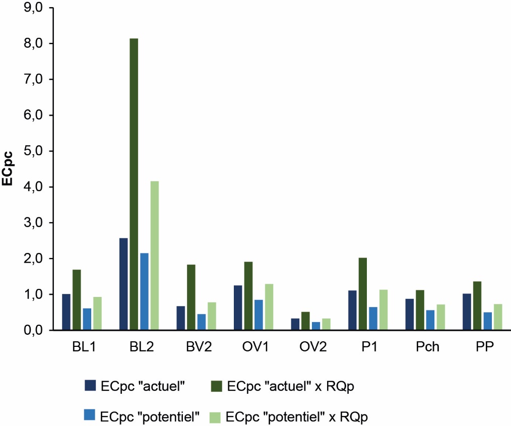 Figure 5. Comparaison entre l’efficience protéique nette et l’efficience protéique nette multipliée par le ratio de qualité des protéines (RQp) des élevages types étudiés (selon les deux scénarios « actuel » et « potentiel » d’utilisation des végétaux).