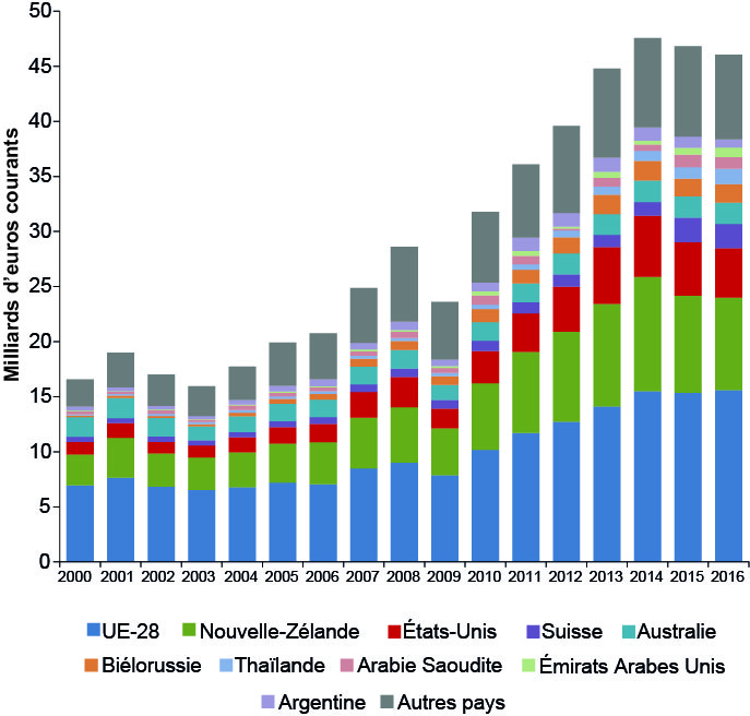 Figure 2. Les principaux exportateurs de produits laitiers entre 2000 et 2016 (milliards d’euros courants) (Source : INRA, SMART-LERECO d’après BACI).