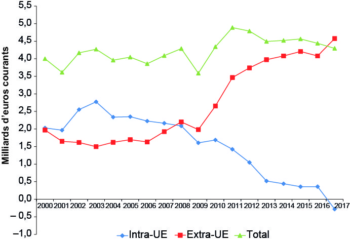 Entre 2000-09 et 2016, la détérioration du solde commercial de la France avec les États membres de l’UE est particulièrement forte dans le secteur avicole (– 866 millions d’euros), en produits laitiers (– 764 millions d’euros) et dans le secteur porcin (– 721 millions d’euros). Les seuls créneaux où le solde a enregistré une hausse sont les bovins vivants (+ 110 millions d’euros), les volailles vivantes (+ 50 millions d’euros) et les porcs vivants (+ 23 millions d’euros). L’amélioration du solde commercial de la France avec les pays tiers est, de son côté, confirmée pour tous les produits identifiés dans le tableau 3, dont surtout les produits laitiers et la viande porcine. La concurrence intra-UE semble donc plus déstabilisante pour l’élevage français que la pression exercée par les pays tiers.
