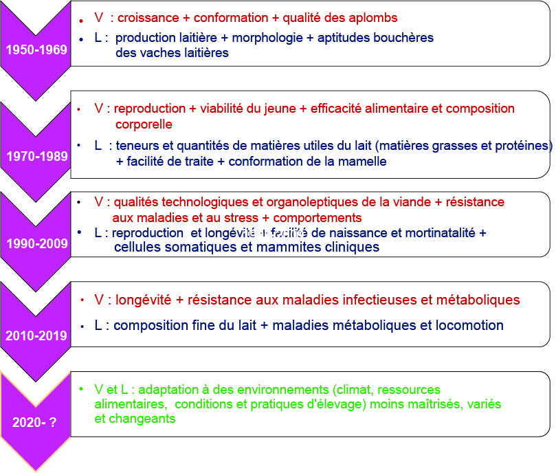 Encadré 1. Historique simplifié de l’intégration de nouveaux caractères dans les objectifs de sélection des volailles, porcs ou ruminants en filières de production de viande (V) ou de lait (L).