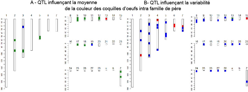 Un protocole expérimental a été mis en place afin de disposer de poules pondeuses, issues d’un même père, mais élevées dans des environnements différents (Romé et al., 2015). Chaque père avait 40 filles nourries ad libitum avec un aliment dit « Basse Énergie » (BE) et 40 filles avec un aliment dit « Haute Énergie » (HE). Toutes ces poules étaient par ailleurs élevées dans les mêmes conditions. La figure de gauche (A) représente les zones du génome (QTL) qui ont un effet fort sur la moyenne de la couleur des coquilles des œufs pondus par les poules d’une famille. Chaque chromosome étudié est représenté par un bâton numéroté (1 à 28 pour les autosomes, a et b pour deux groupes de liaison, Z pour le chromosome sexuel), l’axe vertical donnant la position sur le chromosome, en Mégabases. Les QTL sont représentés par un spot coloré : en bleu, ceux détectés uniquement lorsque les poules reçoivent le régime BE ; en rouge, ceux détectés uniquement lorsque les poules reçoivent le régime HE ; en vert, ceux détectés quel que soit le régime reçu par les poules. La figure de droite (B) représente les QTL qui ont un effet fort sur la variabilité de la couleur des coquilles des œufs dans une famille, les codes couleur étant les mêmes que sur la figure de gauche. On peut observer que : les QTL affectant la moyenne et ceux affectant la variabilité de la couleur de la coquille ne sont pas les mêmes ; il y a plus de QTL influençant la variabilité que la moyenne de la couleur ; la plupart des QTL affectant la moyenne sont détectés quel que soit le régime reçu par les poules ; à l’inverse beaucoup de QTL affectant la variabilité s’expriment avec un seul régime, c’est-à-dire qu’ils sont en interaction avec le régime alimentaire ; une majorité d’entre eux s’expriment alors uniquement lorsque les poules reçoivent le régime BE, c’est-à-dire lorsqu’elles doivent s’adapter, en consommant plus, à un aliment non optimum par rapport à leurs besoins énergétiques.