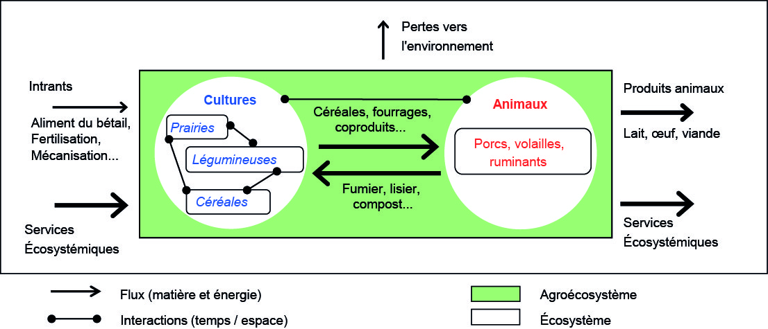 L’élevage à l’échelle nationale paraît efficace et relativement autonome avec d’une part une consommation importante de fourrages, de coproduits et de concentrés non valorisables par l’Homme et d’autre part la fourniture de biens et services comme des produits animaux à haute valeur nutritionnelle et des effluents avec un fort potentiel fertilisant et de production d'énergie. Cependant à l’échelle des territoires, en fonction des densités animales et des systèmes de production, les situations sont très inégales. Il existe des marges de progrès pour mieux boucler les cycles, améliorer l’autonomie, économiser des intrants et diminuer les pertes vers l’environnement. Plusieurs stratégies peuvent être développées : un re-couplage de l’élevage et de l’agriculture de la ferme au territoire, des échanges de flux intra et inter-territoire entre zone d’élevage et de culture ou entre zone urbaine et rurale, un re-bouclage de flux à l’échelle des systèmes alimentaires.