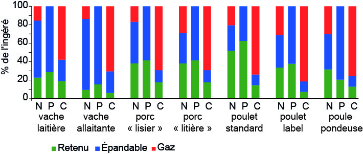 Le pourcentage de rétention azotée est très variable, de 10 à 55 % selon l’espèce animale (figure 3). La quantité d'azote excrété varie entre 45 et 90 % de l'azote ingéré. Toutefois, seule une fraction de l'azote excrété est réellement valorisable pour la fertilisation, compte tenu des émissions gazeuses dans le bâtiment, au stockage et à l’épandage. Dans le cas des vaches allaitantes conduites à l'herbe et dans une moindre mesure dans le cas des vaches laitières, les émissions gazeuses sont relativement faibles, une part importante des déjections étant excrétée au pâturage avec peu de pertes gazeuses. À l'inverse, dans le cas des volailles et des porcs élevés sur litières les pertes gazeuses sont plus importantes. Les porcs élevés sur caillebotis avec production de lisier se trouvent en situation intermédiaire.