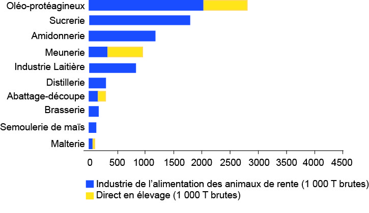 La majorité des coproduits sont valorisés sous forme sèche et pour la plupart en FAB. Il existe toutefois une part des coproduits qui est valorisée directement sous forme humide à proximité et en partenariat avec l'industrie agroalimentaire. Les coproduits utilisés directement en élevage proviennent principalement des industries de la sucrerie, des oléagineux, de la brasserie et de l'industrie laitière (figure 4).