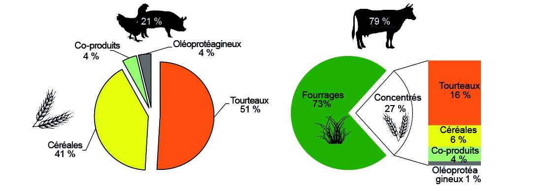 La consommation totale d'aliments par les animaux élevés en France s'élève à 113 Millions de tonnes (Mt) en 2015 ; c'est le flux de bioressources le plus important à l'échelle nationale. Avec environ 70 % du total, les fourrages représentent la part principale de ces aliments, suivis des aliments produits par l'industrie de fabrication d'aliments du bétail (FAB) (19 %) et des matières premières utilisées à la ferme (FAF) (11 %) (Agreste, 2018). Les céréales et leurs coproduits (utilisés en FAB et FAF) constituent la part principale des aliments concentrés. Sur les 53,8 Mt de céréales produites en France (hors riz et maïs ensilage), 37,8 Mt sont exportées sous la forme de grains ou de produits transformés, 5,7 Mt sont utilisées en alimentation humaine après transformation et 16,7 Mt sont utilisées en alimentation animale, soit directement à la ferme (6,9 Mt) soit dans les aliments concentrés (9,3 Mt) sous forme de grains ou de coproduits. L'alimentation animale utilise trois fois plus de céréales que la consommation humaine, soit l'équivalent de 31 % de la production nationale, pour partie sous forme de coproduits.