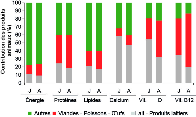 Figure 7. Contribution des produits animaux aux apports moyens d'énergie, de protéines, de lipides, de calcium et de vitamines D et B12, chez les jeunes (J < 18 ans) et les adultes (A) (d’après Anses, 2017).