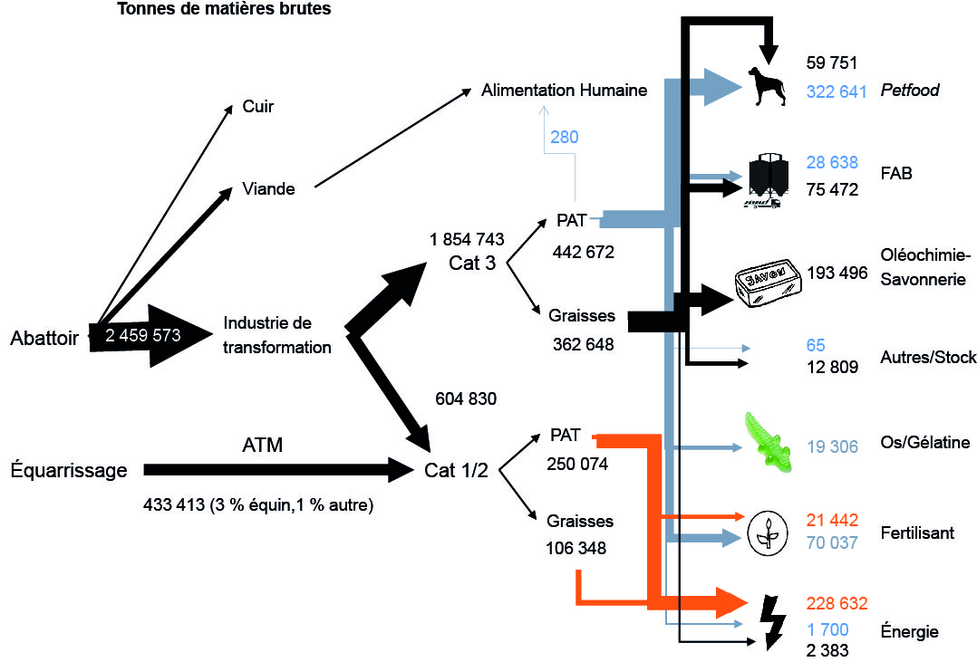 Les coproduits animaux sont transformés dans des unités de production dédiées en fonction de leur catégorie et leur valorisation potentielle, en Protéines Animales Transformées (PAT) et graisses (SIFCO, 2010). Les graisses et PAT de catégorie 1-2 sont majoritairement brulées et produisent de l’énergie et une autre partie sert de fertilisant. Pour la catégorie 3, les graisses sont valorisées pour 55 % en savonnerie et oléo chimie et pour 40 % elles intègrent les aliments pour animaux familiers et l’aliment du bétail. Les PAT sont valorisés à 80 % dans les aliments pour animaux familiers et les aliments pour les poissons.