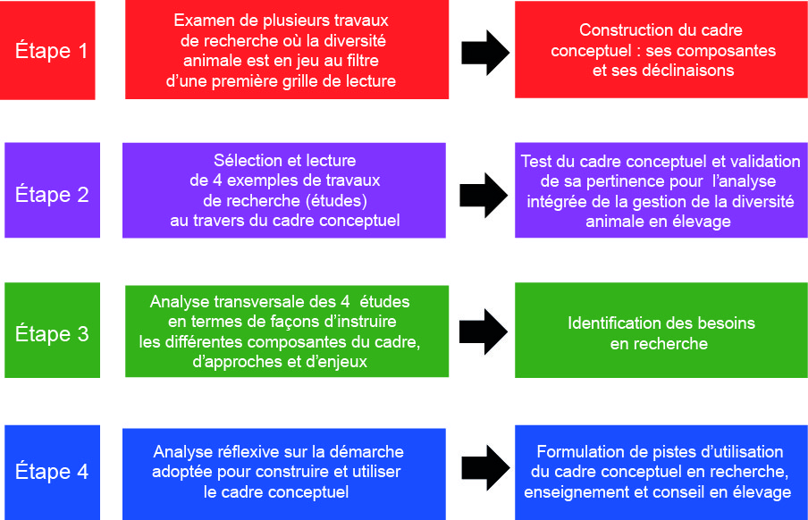 La première étape a consisté à examiner plusieurs travaux de recherche dans lesquels la diversité animale en élevage était en jeu à partir d’une première grille de lecture construite selon notre expertise. Elle a permis de stabiliser les différentes composantes du cadre conceptuel et d’en identifier leurs déclinaisons (partie 1 de l’article). La deuxième étape a consisté à sélectionner quatre études (exemples de recherche) et à les instancier selon le cadre développé. Ces études ont été sélectionnées pour être contrastées en termes de diversité animale considérée et de façon et degré d’instruction des différentes composantes du cadre. Cette étape a permis de tester le cadre conceptuel et d’en montrer la pertinence pour analyser l’ensemble de ce que recouvre la gestion de la diversité animale en élevage dans chaque étude (partie 2). La troisième étape a consisté en l’analyse croisée de ces quatre études. Elle a permis d’identifier des régularités et des différences dans les façons d’instruire les différentes composantes du cadre et de faire émerger des besoins en recherche pour analyser de manière intégrée la gestion de la diversité animale en élevage (partie 3). La dernière étape a consisté en une analyse réflexive sur la démarche adoptée pour construire et utiliser le cadre pour formuler quelques pistes d’utilisation de ce dernier dans la recherche, l’enseignement et le conseil en élevage (partie 4).