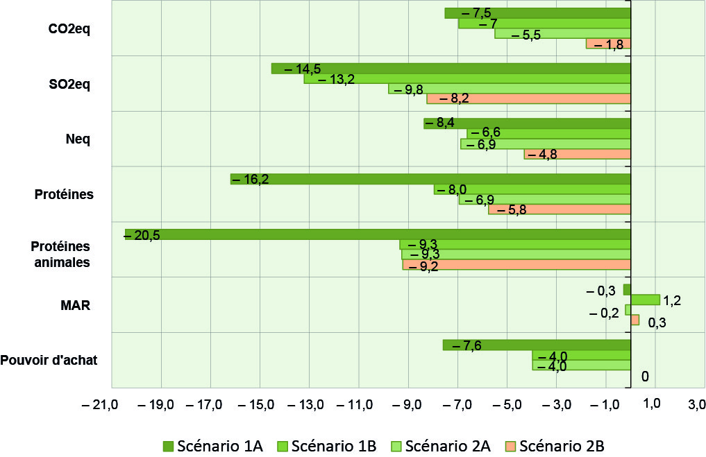 En particulier, les objectifs de durabilité peuvent inciter les gouvernements à susciter un changement d’environnement économique, en incorporant les externalités environnementales des produits animaux. La simulation de hausses de prix montre que de tels scénarios peuvent avoir des effets favorables au-delà de la réduction des émissions. Certes, la prise en compte des dimensions environnementales, nutritionnelles et sociales de la durabilité appelle à de nécessaires compromis, entre bénéfices environnementaux et qualité nutritionnelle, au prix d’un coût supplémentaire pour le consommateur. D’une manière générale, une politique fiscale permettrait d’atteindre simultanément des objectifs d’amélioration de l'environnement et de la nutrition, et constituerait un signal fort à l’attention des consommateurs pour les inciter à modifier leur régime alimentaire.