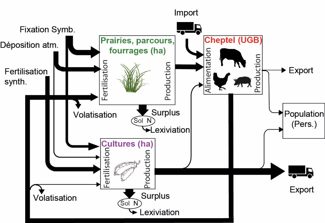 Figure 1. Représentation des flux de matière mobilisés par l’élevage (Méthodologie GRAFS - Generic Representation of Agro-Food Systems, d’après Billen et al., 2014).
