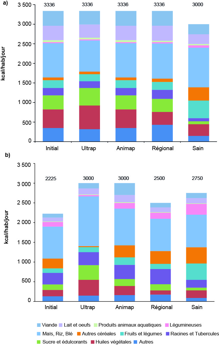 De manière très générale, et en accord avec les évolutions des régimes alimentaires et des chaînes de valeur telles que décrites dans les récits des scénarios, l’hypothèse Ultrap conduit à un régime en 2050 riche en kcal par habitant et par jour, présentant des parts élevées d’huiles végétales et de sucre et intégrant, au sein des viandes, un mouvement significatif de substitution de la viande de volaille aux viandes de ruminants. L’hypothèse Animp conduit également à un régime à haute teneur en énergie, mais cette fois avec une part très élevée de calories d’origine animale, en particulier de viande. Au sein des viandes, la volaille se substitue également aux viandes de ruminants mais dans une bien moindre mesure que sous l’hypothèse précédente. L’hypothèse Régional marque un retour vers les régimes alimentaires traditionnels des différentes régions. Globalement, ceci se traduit par des régimes alimentaires un peu moins riches en énergie, avec une part élevée de racines et tubercules et une part plutôt faible d’huiles végétales. Au sein des viandes, l’hypothèse Régional se traduit par une place réduite de la viande de volaille au profit des viandes de ruminants. Pour les régions traditionnellement tournées vers la viande de petits ruminants (comme l’Afrique du Nord par exemple), l’hypothèse Régional marque le retour de cette viande qui tendait à disparaître progressivement des régimes. Enfin, sous l’hypothèse Sain, les régimes en 2050 sont significativement moins riches en kcal par habitant et par jour, ils contiennent des parts élevées de céréales secondaires, de fruits et légumes et de légumineuses et des parts faibles d’huiles végétales et de sucre. Au sein des viandes, l’hypothèse Sain implique une substitution partielle de la viande par des protéines végétales (légumineuses) et une substitution de la viande de volaille aux viandes de ruminants, pour répondre au double-objectif d’amélioration de la nutrition et de réduction des émissions de gaz à effet de serre porté par le scénario Régimes sains qui utilise cette hypothèse d’évolution des régimes alimentaires.
