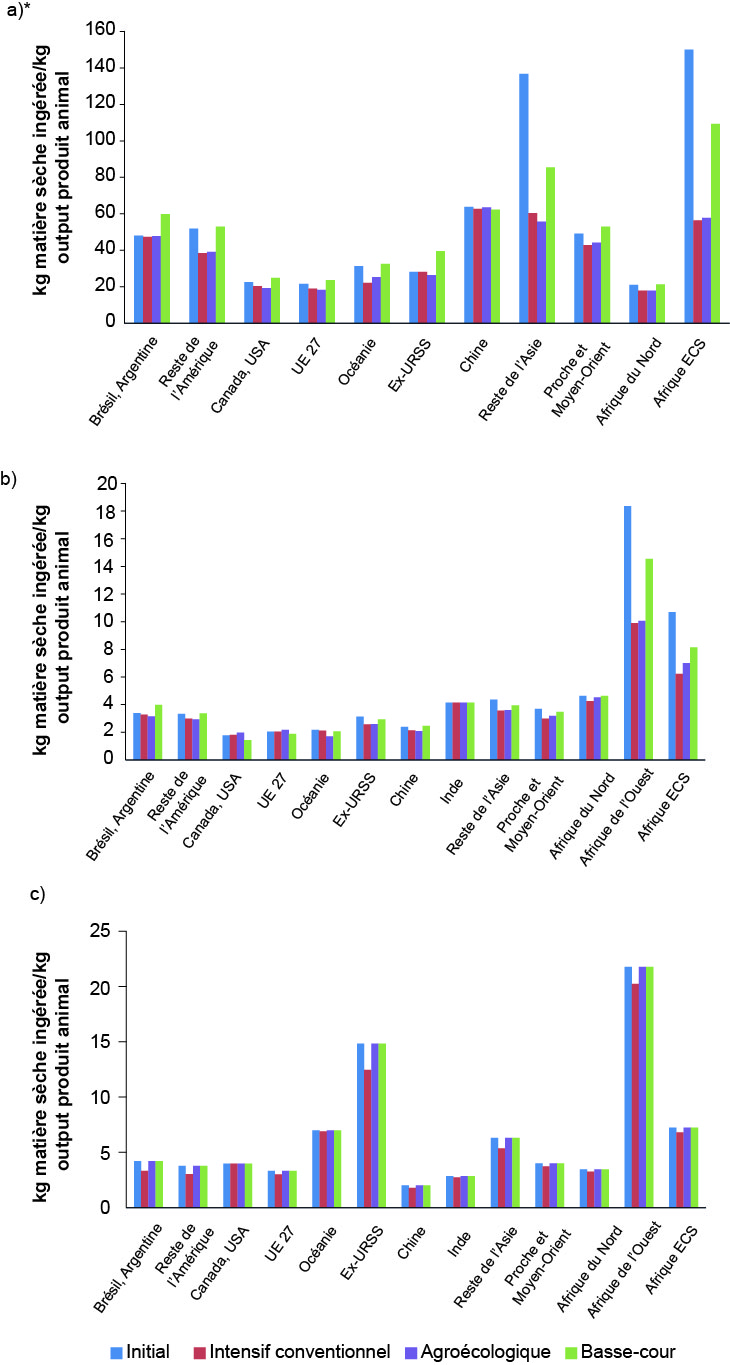 Figure 5. Coefficients inputs/outputs en 2010 et en 2050 pour la viande bovine (a)*, le lait (b) et la viande de volaille (c) sous les trois hypothèses d’évolution alternative (kg de matière sèche d’aliment par kg de produit animal produit, poids équivalent carcasse pour les viandes) (Source : calculé à partir de GlobAgri-AgT).
