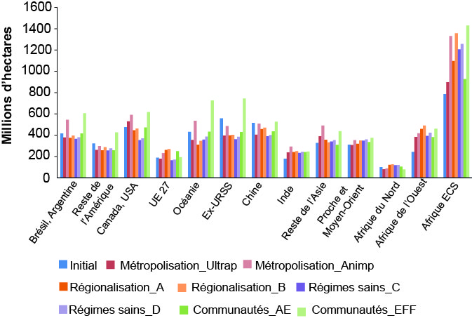 Presque tous les scénarios et leurs variantes conduisent à une expansion des terres agricoles au niveau mondial (tableau 2). L’expansion des terres agricoles mondiales varie néanmoins très fortement d’un scénario à l’autre et, pour chaque scénario, d’une variante à l’autre. L’expansion est particulièrement élevée pour les scénarios impliquant soit une augmentation significative du niveau des calories d’origine animale dans les régimes alimentaires (+ 1,3 milliards d’hectares ou + 27 % par rapport à la situation initiale pour Métropolisation_Animp), soit une stagnation ou une détérioration générale des performances des systèmes de production agricole (+ 2 milliards d’hectares ou + 41 % pour Communautés_EFF). Elle est beaucoup plus faible pour les scénarios impliquant soit une réduction du niveau calorique des régimes alimentaires (+ 142 millions d’hectares ou + 3 % pour Communautés_AE), soit une augmentation limitée du niveau des calories d’origine animale dans ces régimes, accompagnée d’un mouvement de substitution significatif des viandes de ruminants par des viandes de monogastriques (+ 29 millions d’hectares ou + 0,6 % pour Régimes sains_C et – 54 millions d’hectares ou –1 % pour Métropolisation_Ultrap).