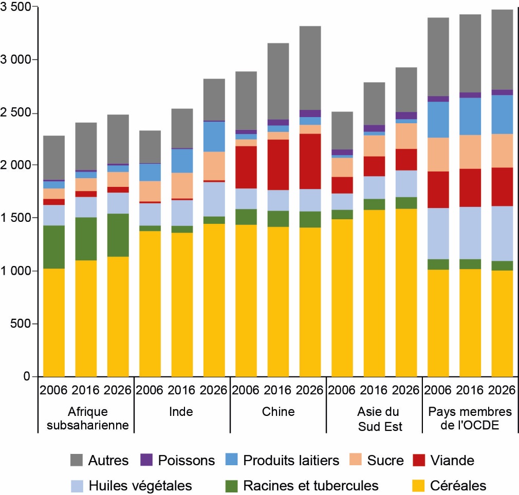 Figure 1. La contribution de différents produits aux apports caloriques totaux des populations de plusieurs pays/zones (kcal/jour/personne) en 2006, 2016, et 2026 (estimations) (Source : OCDE-FAO).