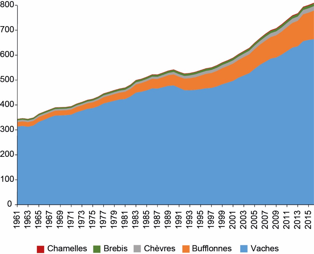 Figure 3. La production mondiale de lait selon les espèces animales : évolution entre 1961et 2016 (en millions de tonnes) (Source : FAO).