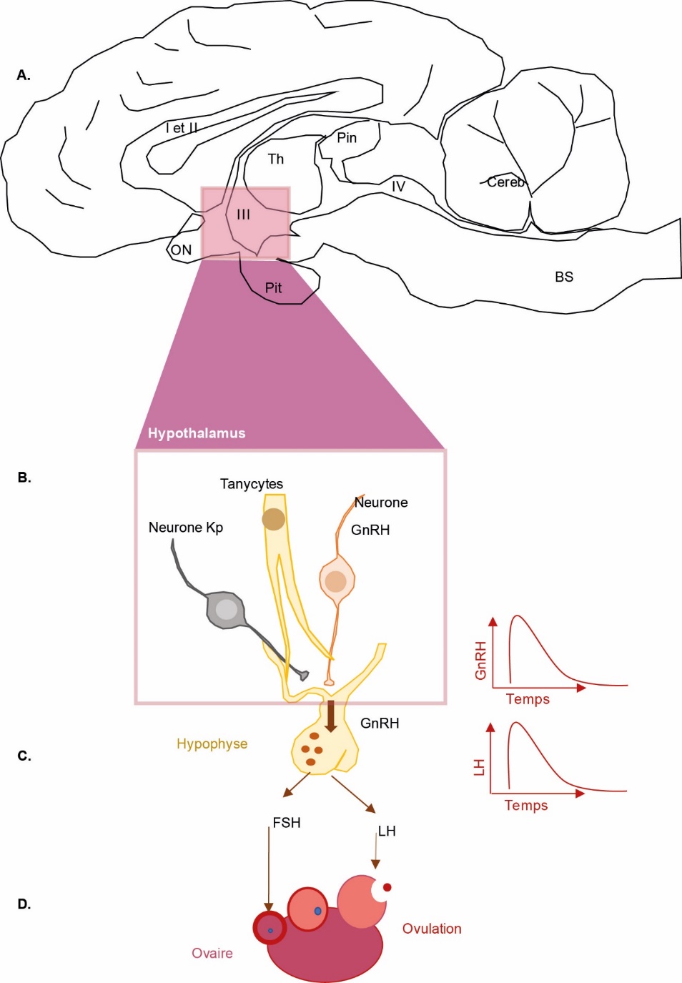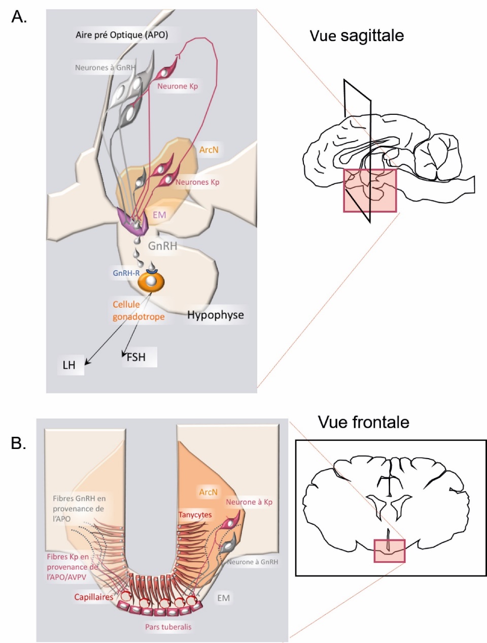 B. Représentation schématique des acteurs hypothalamiques régulant la reproduction : neurones à GnRH, neurones à Kp et tanycytes. Les tanycytes sont des cellules gliales bordant le 3ème ventricule, elles possèdent aussi des propriétés de cellules souches neurales.