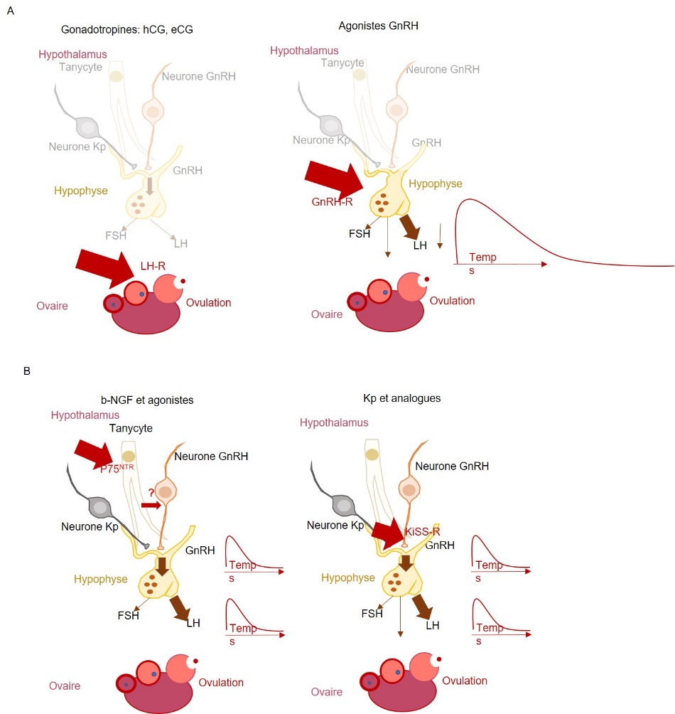 Les mécanismes du déclenchement de l’ovulation sont universels chez les mammifères, ils impliquent la sécrétion de la neurohormone GnRH qui va stimuler la sécrétion de LH qui conduit à l’ovulation du ou des follicules dominants. Cependant, les mécanismes qui déterminent le moment de l’ovulation, c’est à dire ceux qui contrôlent l’augmentation de la sécrétion de GnRH, sont complexes et diffèrent entre les espèces en particulier selon le mode d’ovulation : spontanée ou provoquée. Les méthodes actuelles d’induction de l’ovulation agissent en aval de l’étage hypothalamique et ciblent, soit directement l’ovaire comme lors de l’utilisation d’hCG ou d’eCG, ou bien l’hypophyse avec l’utilisation d’agonistes GnRH. Outre les problèmes de développement d’anticorps suite à l’utilisation de gonadotropines hétérologues, les hormones gonadotropes et les agonistes GnRH entrainent une stimulation supra-physiologique de l’ovaire ou de l’hypophyse. Par ailleurs, dans le cas de l’eCG, le mode de production de cette hormone par des juments gestantes pose des problèmes éthiques relayés par des associations de défense des animaux et par les media européens. Les nouveaux paradigmes pour le déclenchement de l’ovulation ciblent l’étage hypothalamique et la régulation de l’activité des neurones à GnRH, permettant le déclenchement physiologique de l’ovulation. Le C6, un agoniste de la Kp, permet l’induction de l’ovulation chez les petits ruminants après une seule administration. Plusieurs avantages potentiels seraient liés à son utilisation : absence d’hyperstimulation, utilisation d’une dose faible générant peu ou pas de résidus libérés dans l’environnement, manque d’activité après ingestion qui est la voie classique de contamination des perturbateurs endocriniens. En ce qui concerne le β-NGF, la littérature scientifique est moins abondante, mais il offre de belles perspectives chez des espèces pour lesquelles la Kp n’est pas ou est moins efficace, comme dans le cas de la jument.