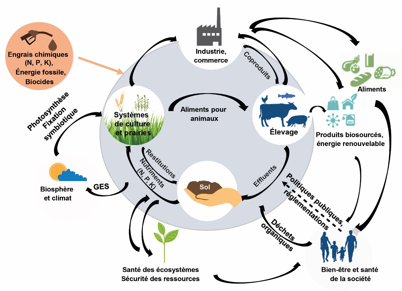 Le développement de systèmes agri-alimentaires circulaires et durables ne peut s’envisager sans un élevage lui-même multiperformant, dont l’empreinte carbone soit neutre, résilient au changement climatique et assurant la santé de l’animal, de l’Homme et des écosystèmes. La recherche doit permettre de lever les verrous en travaillant sur les émissions de GES (CH4, N2O, CO2), le stockage de C et l’adaptation aux changements climatiques au niveau de l’animal, des effluents, de la conduite des systèmes, des filières et des outils de politiques publiques incitant aux changements tout en contribuant à fortement réduire voire annuler les émissions vers les agroécosystèmes des autres formes d’N réactif (ammoniac, nitrate) et du phosphore. Dans le même temps, et d’ailleurs les deux sont liés, il faut mettre le bien-être et la santé des animaux et des Hommes au cœur des préoccupations pour la conception de nouveaux systèmes d’élevage. Ces objectifs peuvent être source de tensions et des compromis seront à trouver. Par exemple, l’accès des animaux à des parcours extérieurs pour le bien-être peut conduire à une maîtrise plus difficile des émissions vers l’air et l’eau, et de la santé (exposition à la faune sauvage).