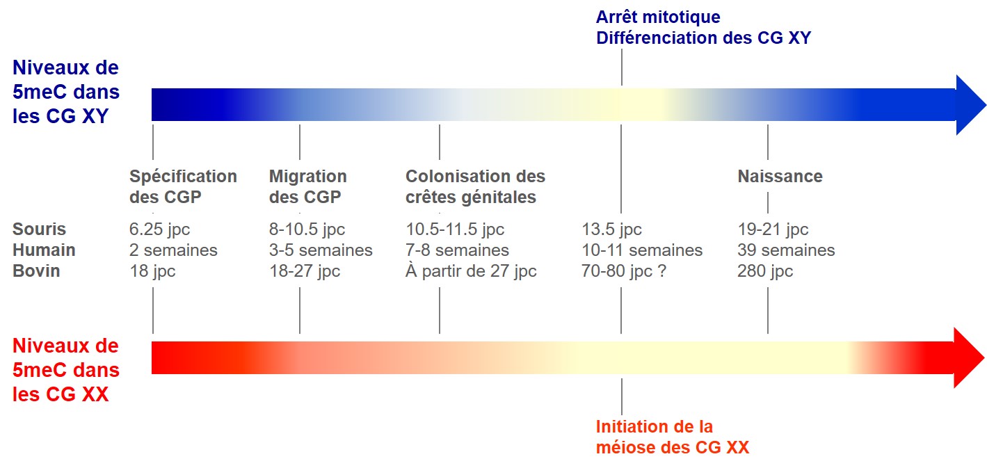 L’intensité de couleur des flèches explicite les niveaux de méthylation de l’ADN des CG en fonction des stades de développement chez la souris. Ainsi, lors de leur migration, puis de la colonisation des crêtes génitales, les CG déméthylent progressivement leur génome, pour atteindre le niveau de méthylation le plus bas au stade précédent la méiose dans l’ovaire et l’arrêt des mitoses des CG dans le testicule. Chez les mâles une nouvelle méthylation est rapidement apposée, alors que chez les femelles, la méthylation de l’ADN de l’ovocyte débutera lors de la maturation ovocytaire des follicules en croissance. L’évolution de la méthylation de l’ADN dans les CG fœtales bovines n’est pas connue l’équivalence des stades de développement est mentionnée à titre indicatif. Jpc : jour post conception CGP : CG primordiales.