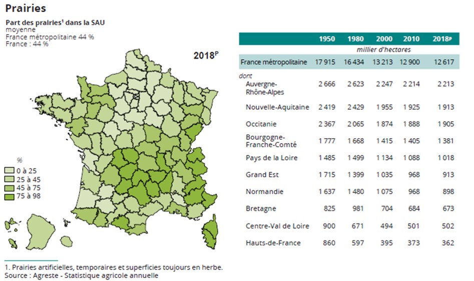 Les prairies sont des surfaces agricoles dont la végétation est utilisée pour la production de fourrage à récolter et /ou pour le pâturage d'animaux d'élevage. Le terme « prairies » recouvre les prairies permanentes, les prairies temporaires, et les prairies artificielles (Allen et al., 2011 ; Peeters et al., 2014). La figure 1 montre la répartition des prairies sur le territoire français et son évolution depuis 1950 selon les régions.