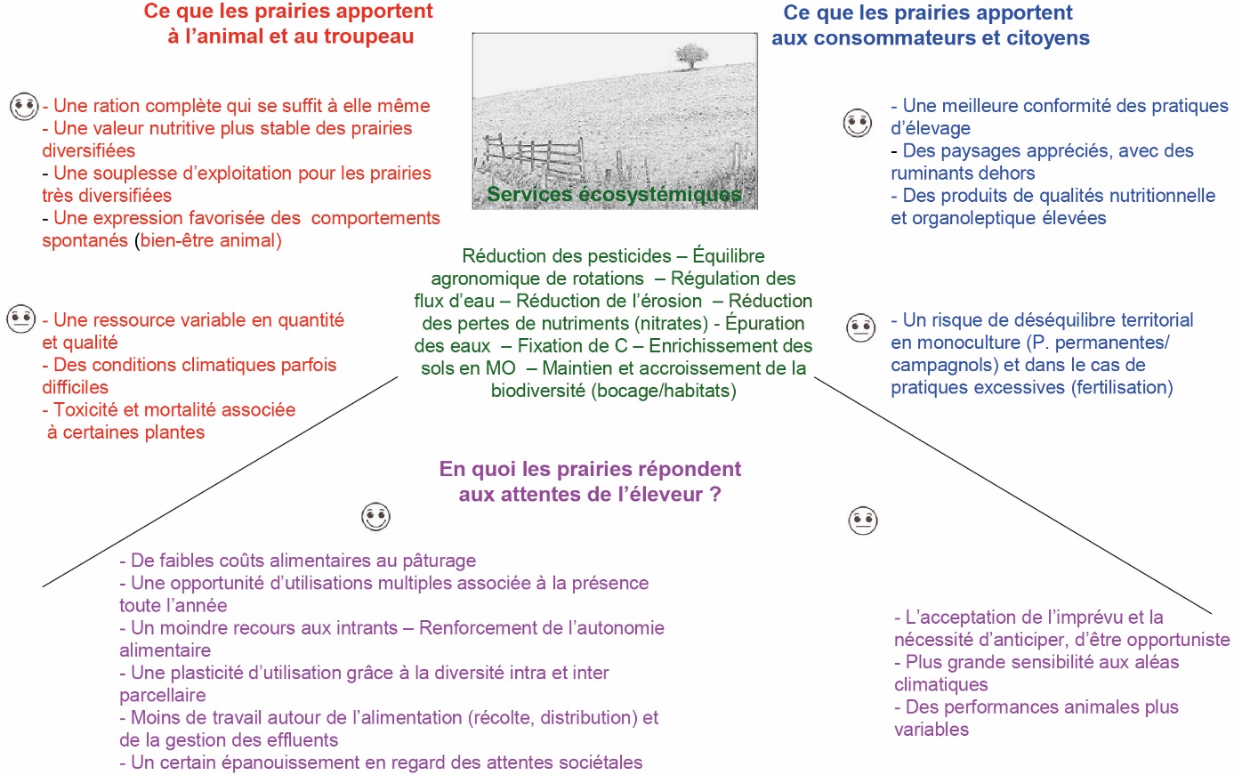 Les écosystèmes prairiaux sont à l'origine de nombreux bénéfices dont l'Homme tire avantage (figure 2). À ce titre, les bénéfices environnementaux des prairies permanentes et temporaires sont multiples : limitation de l'érosion, régulation des flux d'eaux (prévention des crues, stockage d'eau), filtration des polluants minéraux et organiques pour les prairies en général et préservation de la biodiversité floristique, faunistique et microbienne (surtout si la gestion de la prairie est extensive), réduction du bilan des GES en élevage via une séquestration de carbone proche de celle d'une forêt, intérêt paysager plus particulièrement pour les prairies permanentes (Mauchamp et al., 2013).