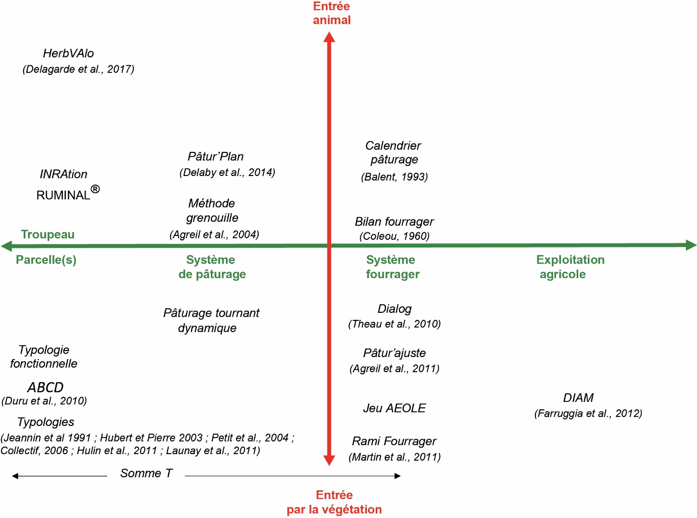ii) à l'échelle du système de pâturage. Ils sont très développés en France et concernent la conduite des systèmes herbagers avec une pression forte sur l'herbe (par exemple Pâtur'Plan, Delaby et al., 2014), ceux adoptant un pâturage tournant plus ou moins lent ou des systèmes plus extensifs reposant sur des couverts avec des ligneux (méthode Grenouille en milieu méditerranéen, Agreil et al., 2004). Des outils d'analyse a posteriori qui permettent d'objectiver la valorisation de ces prairies, tel Herb'Valo (Delagarde et al., 2017) sont également disponibles ;