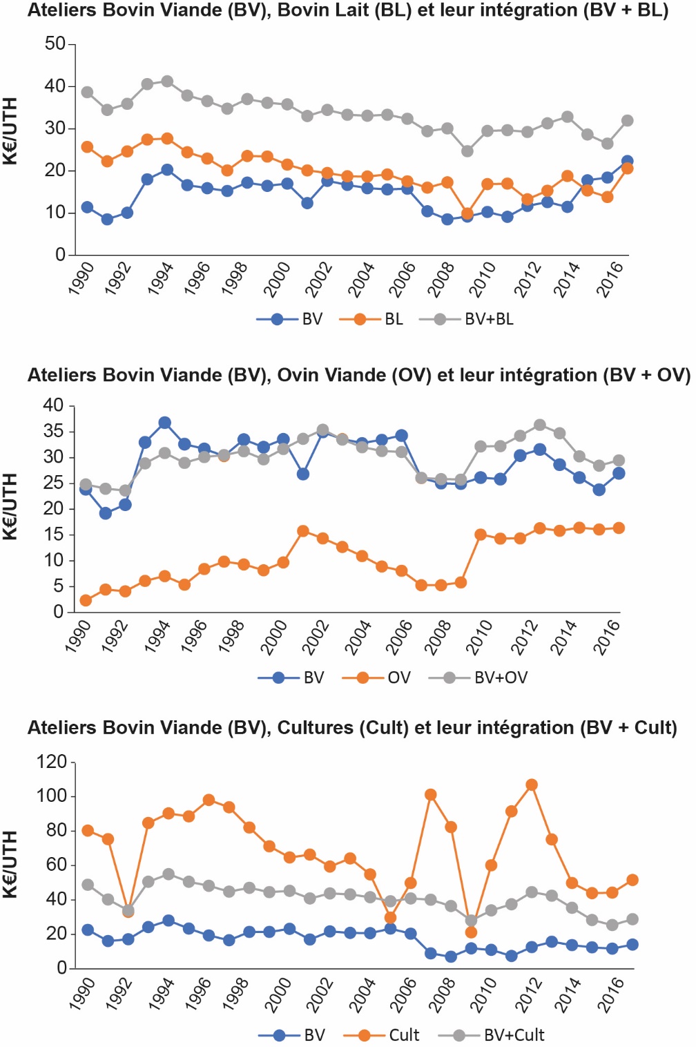 Figure 3. Effet des évolutions du marché et des politiques publiques sur le revenu net par travailleur (en k€/UTH) dans trois systèmes mixtes auvergnats lorsque chaque atelier est géré de façon séparée ou intégré au sein d’une même exploitation