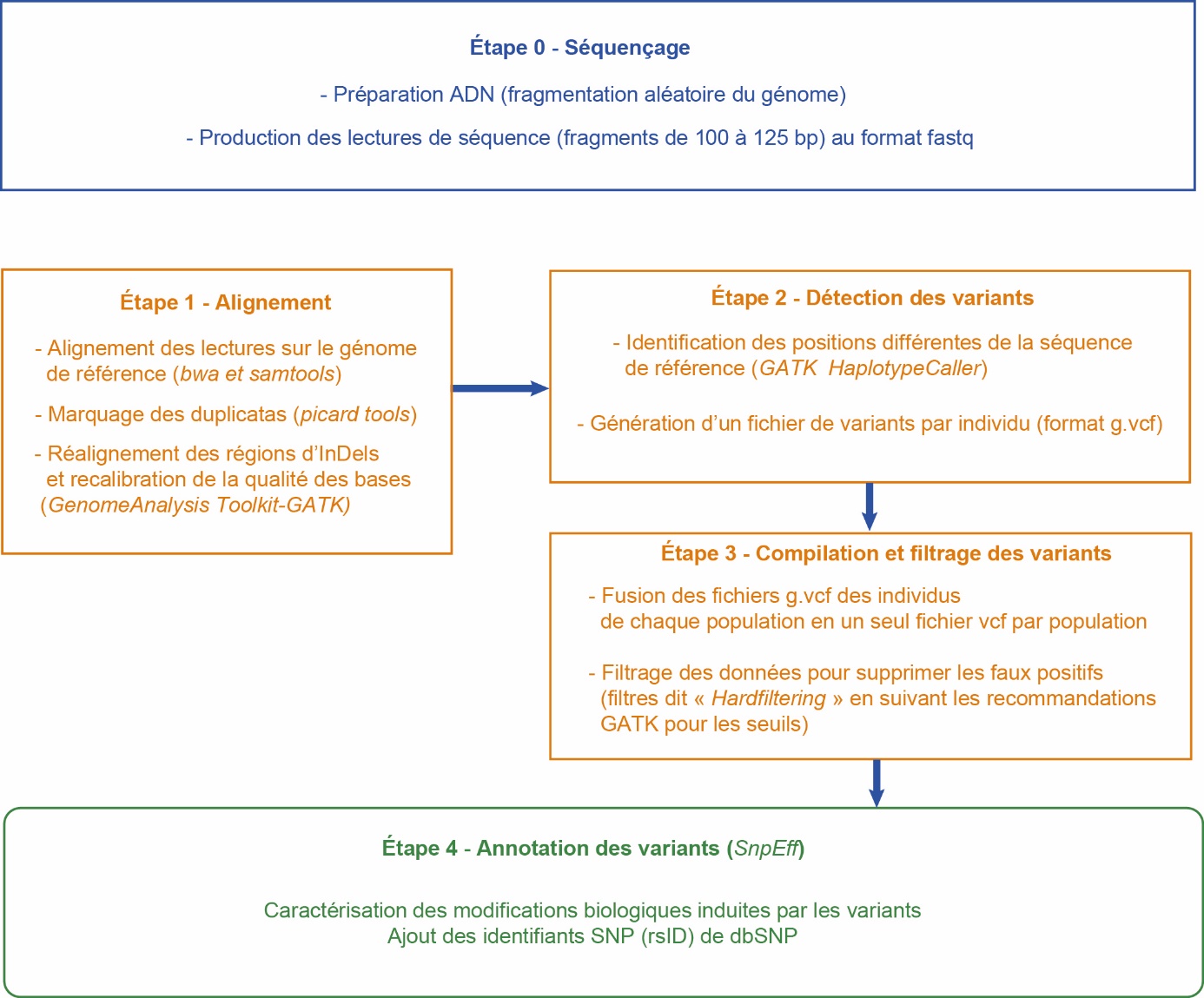 Après le séquençage, l’étape 1 identifie les fragments obtenus en les alignant sur le génome de référence. L’étape 2 compare les fragments localisés à la séquence de référence pour en identifier les variations. L’étape 3 applique différents filtres pour éliminer les faux positifs. L’étape 4 (facultative) est l’annotation fonctionnelle des variants. Les noms des outils bioinformatiques dédiés sont indiqués en italique. L’acronyme dbSNP est défini dans l’encadré 1.
