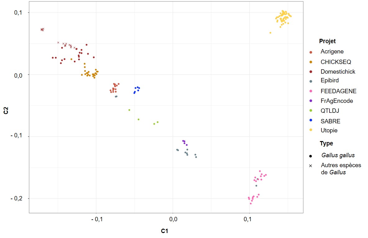 Au niveau international, les autres institutions les plus intéressées sont en Chine et en Corée. Les équipes américaines contactées n'ont pas souhaité s'engager ou bien ont proposé de commencer par stocker les données rassemblées, ce qui n'était pas notre demande. Récemment une étude chinoise a rassemblé 863 séquences pour analyser la diversité des races et la domestication de la poule (Wang et al., 2020). Le coordinateur chinois a produit 787 séquences individuelles, avec une profondeur de 20X pour au moins un individu de chaque espèce ou sous-espèce sauvage, avec de nombreux collaborateurs fournisseurs d'échantillons. La stratégie choisie ici est de rassembler des échantillons pour les séquencer par un seul partenaire, une stratégie complètement différente de celle du projet 1000 génomes. Les résultats sur le scénario de domestication méritent d'être confrontés à d'autres études qui diffèrent par l'échantillonnage des individus sauvages, et un partage de données serait certainement fructueux. Dans cette étude, les résultats sur les signatures de sélection sont commentés pour quelques gènes particuliers impliqués dans le développement (FGFR1, récepteur du facteur de croissance des fibroblastes), ou dans la fonction de reproduction (GNRH-1, hormone contrôlant la libération des gonadotropines, KIF18A, kynésine 18A impliquée dans la mitose des spermatogonies), qui ne sont pas les mêmes que ceux mis en avant par Qanbari et al. (2019). Enfin, l'histoire de la mutation Gly558Arg du récepteur de la thyréostimuline (gène TSHR), absente chez l'ancêtre sauvage et proposée comme une mutation de domestication en 2010, puis confirmée en 2014 comme une mutation favorisée par la sélection de la poule domestique au cours des siècles, apparait assez différente, car la mutation a été identifiée chez une sous-espèce sauvage pour la première fois. L'importance de l'échantillonnage des individus sauvages doit être soulignée, car des phénomènes de croisement incontrôlé avec des poules domestiques pourraient s'être produits.