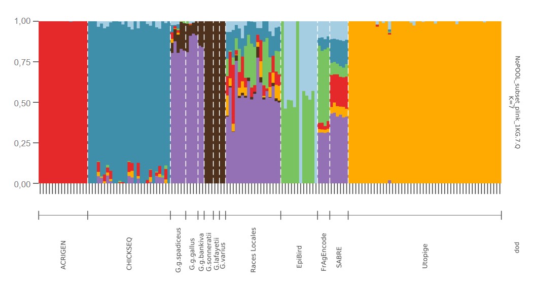L’analyse de structure de population fait apparaitre sept regroupements ou clusters (figure 3). Le cluster 4 est défini par le projet ACRIGEN (poulet de chair moderne) et le cluster 5 par le projet UtOpiGe (pondeuses œufs bruns) alors que le cluster 2 est caractéristique du projet ChickSeq (lignée ancienne de poulet de chair), mais on détecte un apparentement faible avec d’autres clusters à l’intérieur de ce groupe. Les animaux sauvages Gallus gallus définissent le cluster 7 et ceux des 3 autres espèces le cluster 6. Les races locales ont un fort apparentement au cluster 7 et montrent un apparentement faible à modéré avec tous les autres clusters, y compris le cluster 6, ce qui traduit l’absence de sélection forte chez ces populations qui sont ainsi plus proches de l’ancêtre sauvage non sélectionné. Le cluster 3 correspond probablement à l’origine White Leghorn présente dans les projets Epibird et Fr-AgEncode. Enfin, le projet SABRE, constitué d’animaux croisés F1 entre des lignées de poulet label, montre logiquement une composition diversifiée du génome avec un apparentement à 6 clusters, assez proche de la situation observée pour les races locales. Il est possible d’identifier quelques régions du génome qui sont encore partagées entre des races locales et des races très sélectionnées alors que les races très sélectionnées ont définitivement perdu une fraction de la diversité génomique de l’espèce Gallus et sont les plus éloignées de l’ancêtre sauvage.