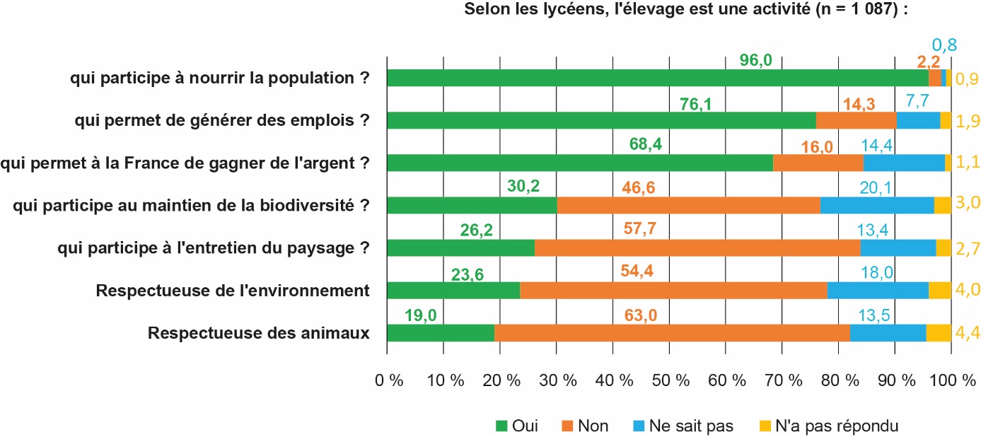 Pour 76 % d’entre eux, l’élevage permettrait de créer et de conserver des emplois en France, et certains l’ont appuyé à nouveau dans une question ouverte en fin du questionnaire : « La France est un pays agricole », « On a déjà beaucoup de chômeurs, on ne va pas se priver d’un secteur qui peut créer des emplois ». L’élevage permet de générer de la valeur ajoutée en France (« gagner de l’argent ») pour 68 % d’entre eux. Certains lycéens interrogés citent également d’autres rôles essentiels de l’élevage français : fournir de la viande, aliment indispensable à un régime équilibré, préserver un patrimoine (tradition, races d’animaux...), et limiter les besoins d’importations alors que la France a des standards de production plus élevés que d’autres pays.