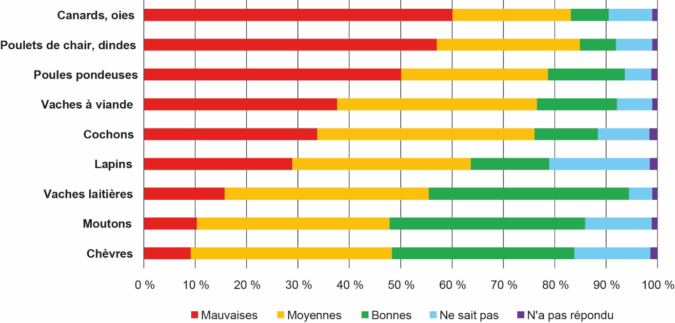 Pour les lycéens qui se sont exprimés dans les questions ouvertes, le mode d'élevage « intensif » est la première cause de mal-être animal, ainsi que des actions de maltraitance. Par ailleurs, 31 % des élèves pensent que les éleveurs ne prennent pas soin de leurs animaux, contre 50 % qui pensent le contraire. Pour eux, comme dans la plupart des enquêtes et sondages réalisés auprès du grand public ces dernières années, l'accès au plein-air pour tous les animaux est une condition indispensable pour garantir leur bien-être (Chouteau et al., 2018b ; Delanoue et al., 2018b).
