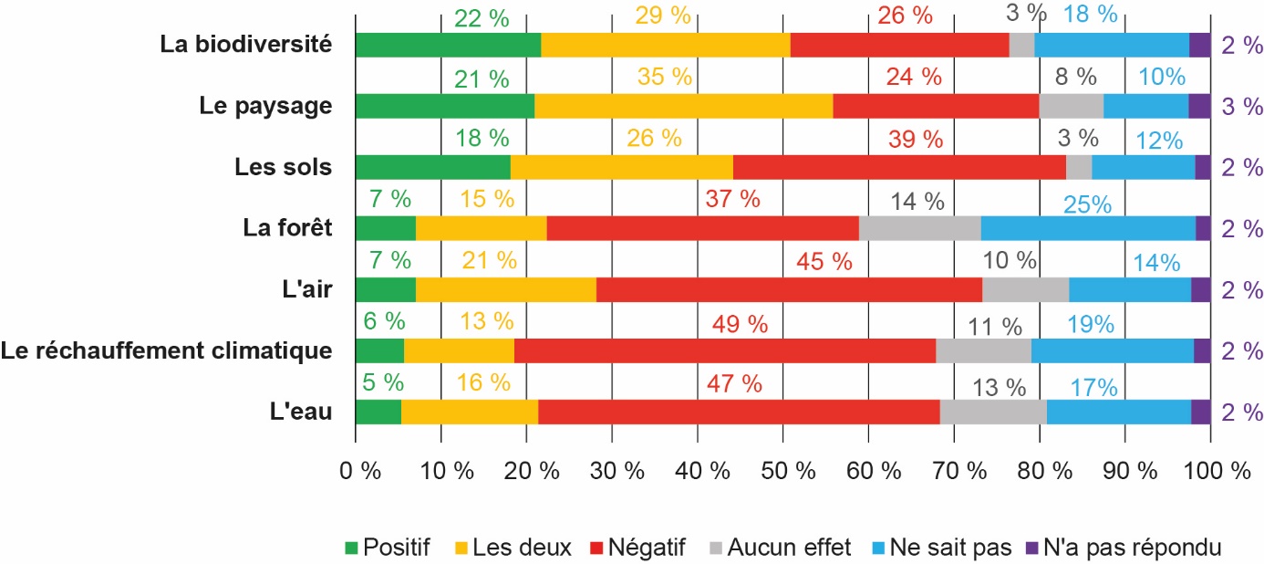 De nombreux lycéens ont une vision assez négative des impacts de l’élevage sur l’environnement : 54 % d’entre eux pensent qu’il a un impact plutôt négatif, en particulier sur le réchauffement climatique, la qualité de l’eau, de l’air, et la forêt (figure 4). Néanmoins, une proportion d’élèves plus faible, autour de 20 %, ont identifié des impacts positifs sur l’environnement, notamment sur la biodiversité, le paysage et les sols.