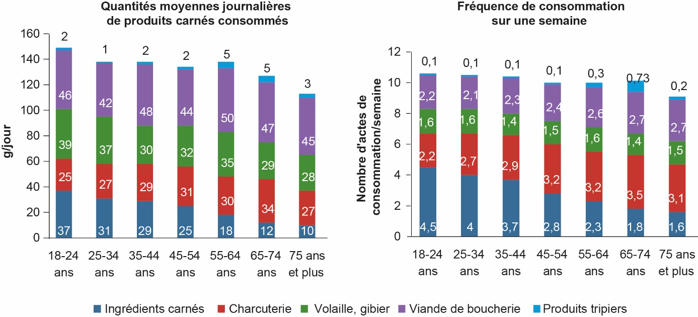 Figure 5. Consommation de viande des français selon leur classe d’âge (d’après Tavoularis et Sauvage, 2018).