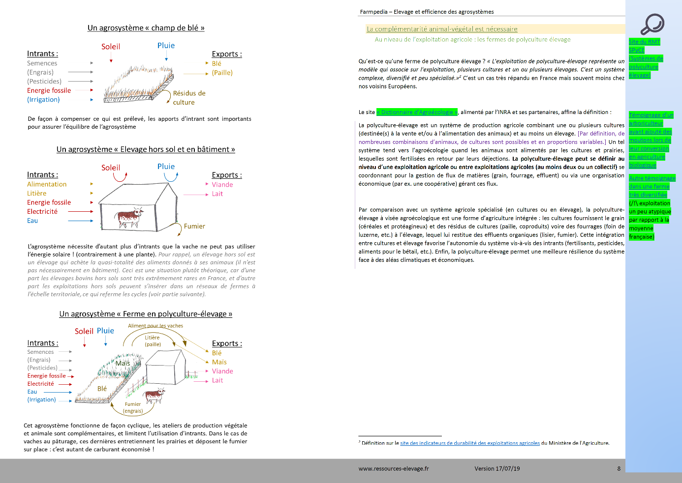 Farmpedia est une boîte à outil pour les enseignants : on retrouve pour chaque chapitre une synthèse sur le sujet (texte de la page de droite), avec les sources des informations citées (en bas de page), des illustrations (sur la page de gauche) et des suggestions de ressources à mobiliser (dans la marge de droite).