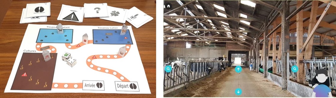 La photo de gauche présente le plateau de jeu de « The Gameuuuh », jeu gagnant du concours « Un jeu sérieux pour expliquer l’élevage » dans la catégorie après-bac. Les élèves doivent avancer sur le plateau de jeu qui représente différents ateliers d’une ferme en répondant à des questions indiquées sur les cartes fournies. La photo de droite est une capture d’écran du jeu en ligne réalisé par le groupe Enseigner l’élevage, basé sur une visite virtuelle de la ferme de Grignon, sur le principe de l’escape game. Ces jeux sont accessibles en ligne sur le site www.ressources-elevage.fr.
