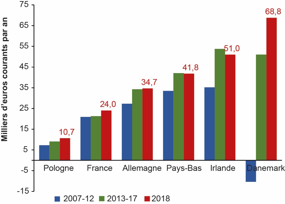Ainsi, le solde commercial de la France en produits laitiers est, en 2019, de 2,49 millions de Teql pour 3,1 milliards d’euros. Le taux d’autosuffisance moyen est de 111 % : il est beaucoup plus fort pour les protéines laitières que pour la matière grasse pour laquelle il est proche de 100 %(You, 2019). Même si ce solde est toujours positif avec les États membres de l’UE (441 millions d’euros en 2019), une forte détérioration est observée depuis 2010-14 (1,6 milliard d’euros en moyenne annuelle). Celle-ci se retrouve avec la plupart des principaux partenaires européens, notamment les Pays-Bas et l’Irlande (creusement des déficits), l’Italie et l’Espagne (réduction ou disparition de l’excédent) (tableau 1).