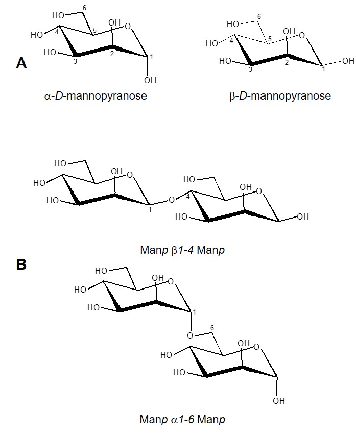 Les polymères de mannose sont des polysaccharides, macromolécules constituées de monomères d’oses (glucose, mannose, galactose…) reliés par des liaisons glycosidiques (figure 1). Les masses moléculaires des polysaccharides sont élevées, et le terme d’oligosaccharide est réservé à un Degré de Polymérisation (DP) inférieur ou égal à 10-20. Certains polysaccharides, comme la cellulose ou le glycogène ont des noms usuels qui n’informent pas sur leur composition en oses. En général les polysaccharides sont nommés d’après le constituant majeur de leur chaine principale. Ainsi, les mannanes sont des polysaccharides constitués majoritairement de mannose. La présence d’autres oses plus minoritaires dans le polymère est ensuite indiquée en préfixe correspondant au nom de l’ose. Par exemple, un glucomannane est un polymère de mannose contenant également du glucose mais dans une moindre mesure. Toutefois, pour rendre compte de la structure, il est nécessaire de préciser l’anomérie (alpha ou beta) et le type de liaison ((1,2) (1,3) (1,4) et (1,6)) entre monomères (figure 1). La nature de l’ose, le type de liaison et son anomérie, la séquence des monomères, la longueur des chaînes, la présence de substituants (osidiques ou non) influencent la conformation des polysaccharides et déterminent les capacités d’interactions et les comportements physico-chimiques de ces macromolécules. Ces niveaux fins de la structure des polymères et oligomères de mannose sont déterminants pour leur reconnaissance par les récepteurs cellulaires impliqués dans les interactions entre cellules, dans les réactions hôte-pathogène, et pour leur dégradation enzymatique par les glycoside-hydrolases.