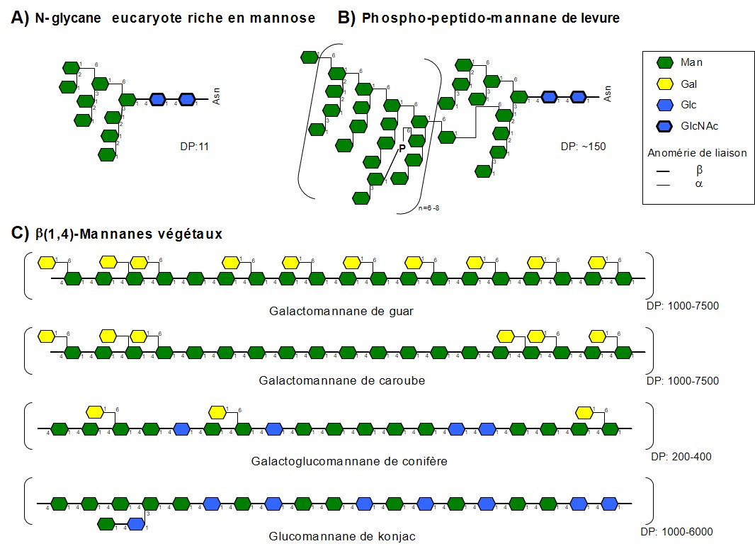 Les polymères du mannose rencontrés dans le monde vivant peuvent revêtir de grandes diversités structurales. Longueurs de chaînes, anomérie (α ou β), type de liaisons (1,2/1,3/1,4/1,6), longueur et composition des ramifications sont autant de facteurs de variation qui donnent à ces polymères des fonctions biologiques très différentes. Impliqués dans le maintien de la structure des protéines, ils jouent chez de nombreux organismes des rôles essentiels dans les processus d’interaction récepteur-ligand et de fait dans la reconnaissance de motifs conservés des microorganismes pathogènes par les cellules infectées.