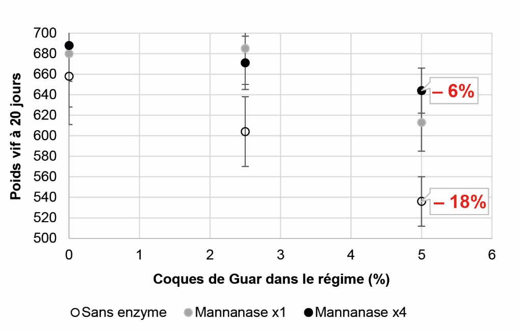 L'utilisation de la farine de guar en alimentation animale est très documentée dans la littérature du fait de sa teneur importante en β-mannanes en majorité solubles (de 4,3 à 17,0 % selon les auteurs –tableau 1). Elle est également très riche en protéines (de 35 à 47 % selon la variété et la qualité de la matière première ; Saeed et al., 2017) ce qui en fait un excellent candidat pour se substituer partiellement au tourteau de soja dans les pays où la matière première est disponible en quantités suffisantes (en Asie surtout). Cependant, on constate que son utilisation est proportionnellement associée à une baisse des performances zootechniques que beaucoup d'auteurs attribuent aux β-mannanes (figures 3 et 4).