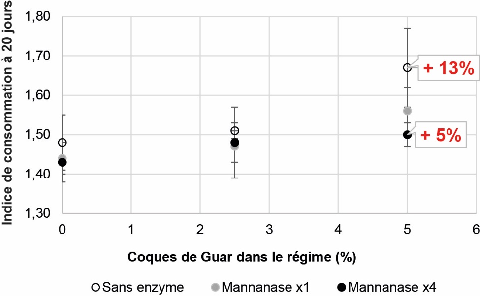 Figure 4. Effet antinutritionnel d'un apport croissant de β-mannanes du Guar couplé ou pas à une supplémentation en enzyme sur l'Indice de Consommation (1-20 jours) chez le poulet de chair (d'après Lee et al., 2003).