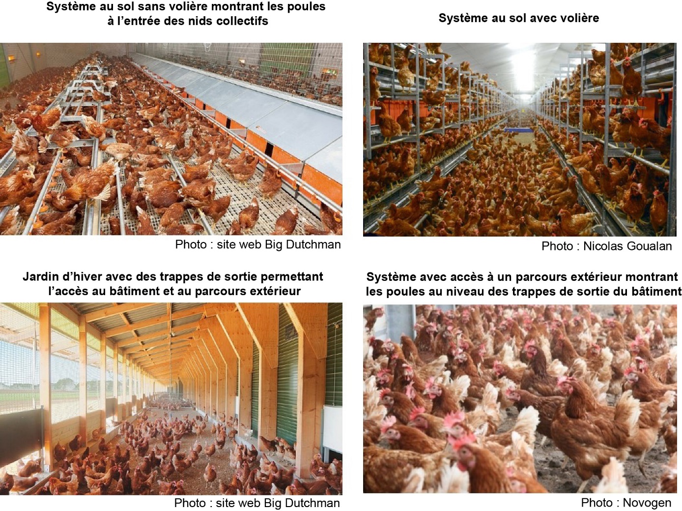 En Europe, l’élevage des poules pondeuses à l’étage de production était majoritairement en cages collectives. Depuis 2012, ces cages sont dites « cages aménagées » car équipées de nids, de perchoirs et d’une aire de grattage. Ces dernières années, une grande diversité de systèmes d’élevage, dits « alternatifs » à la cage, se sont aussi rapidement développés afin d’offrir aux animaux des conditions de vie en adéquation avec les besoins de l'espèce. Dans ces systèmes, les poules évoluent librement dans un bâtiment équipé ou non d’une volière (plusieurs étages dans le bâtiment ; figure 1). Attenant au bâtiment, il y a parfois une aire d’exercice couverte et grillagée (jardin d’hiver ; figure 1) permettant aux poules d’avoir accès à la lumière naturelle et aux conditions climatiques extérieures, tout en étant protégées des intempéries. Certains bâtiments disposent d’un accès à un parcours extérieur, ce sont les systèmes « plein air », « plein air Label Rouge » et « plein air biologique » (figure 1). Les systèmes sans parcours extérieur sont appelés systèmes « au sol » (figure 1). Que les poules aient accès à un jardin d’hiver ou à un parcours extérieur, la lumière naturelle est souvent complétée par de la lumière artificielle, surtout quand les jours sont courts. La législation européenne impose que le programme lumineux suive un rythme de 24 h, comportant une période nocturne continue d’au moins 8 h, et une intensité lumineuse permettant aux poules de voir et d’être vues clairement (Directive 1999/74/CE).
